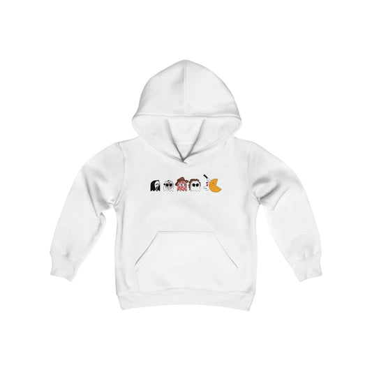 Pac-Man Halloween Horror Movie Characters Halloween 2024 Kids Sweatshirt with Scream, Jason, Freddy, and Michael Halloween Hoodie Retro