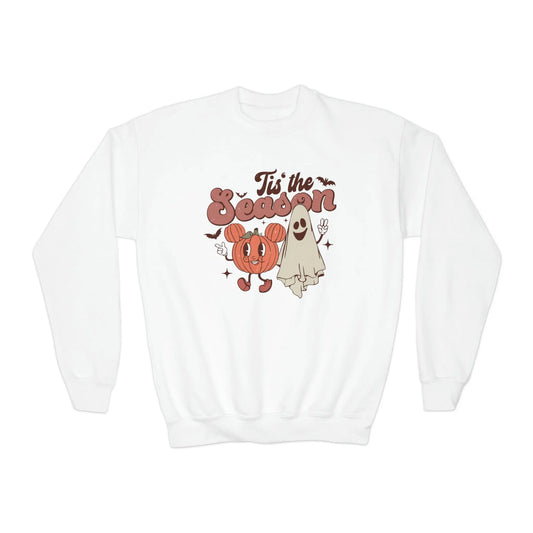 Retro Vintage Boho 'Tis the Season' Kids Sweatshirt Cute Halloween 2024 Pumpkin and Ghost